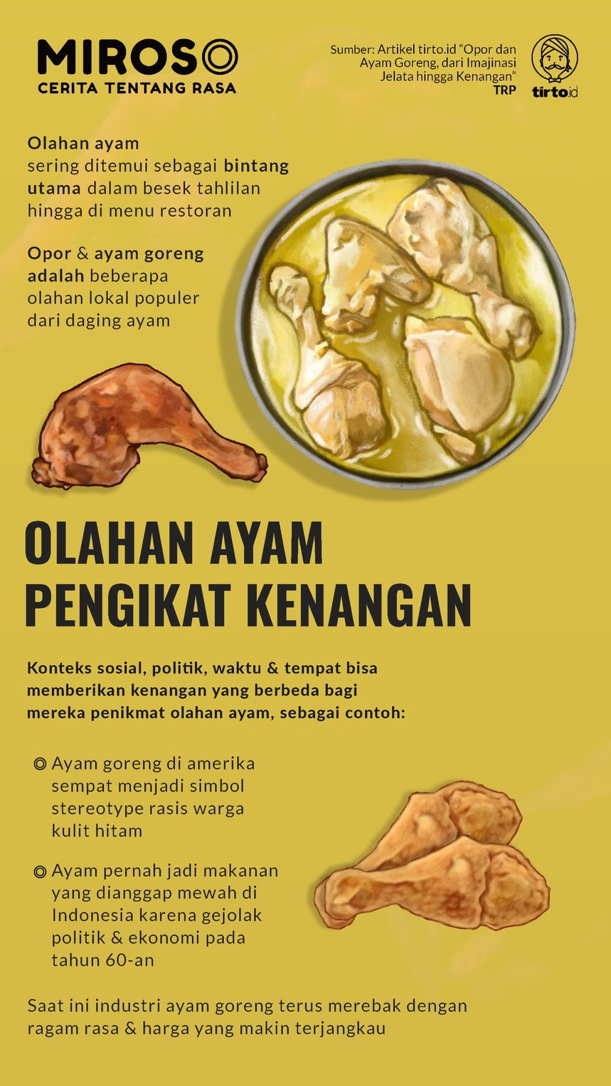 Saat saya kecil, imajinasi tentang makanan enak dan mewah adalah olahan ayam seperti ayam goreng atau opor ayam. Jika bertamu dan dijamu dengan masakan ini, itu jadi penanda bahwa si tuan rumah berasal dari kalangan ekonomi mapan. Sebagai anak kecil era 90-an yang lahir di kabupaten Magelang, ayam goreng yang biasa saya jajal berasal dari besek anyaman bambu berkatan sepulang bapak dari tahlilan.